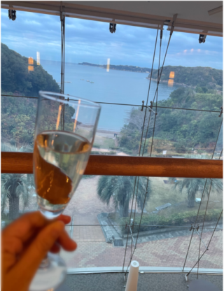 その後は宿泊先の里創人倶楽部 伊勢志摩へ移動。車で10分もかからなくてすぐ近く。まずウエルカムドリンクだけでなく、ウエルカム焼き立てピザまでいただきました。夕飯の時間が17:30と19:30から選べて後半の19:30を選んでたから、ちょうど小腹が空いた時にピッタリ!しかも美味しい。